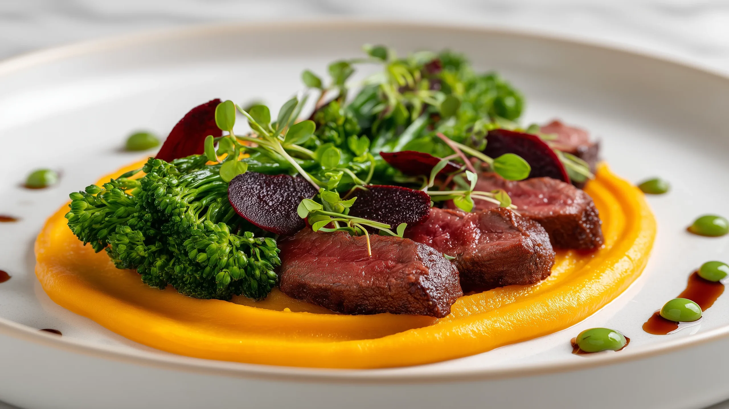 High-End Vegan: Saftiges Planted Steak auf cremigem Süßkartoffelpüree, begleitet von wildem Brokkoli, dunkler Jus und knusprigen Gemüsechips.