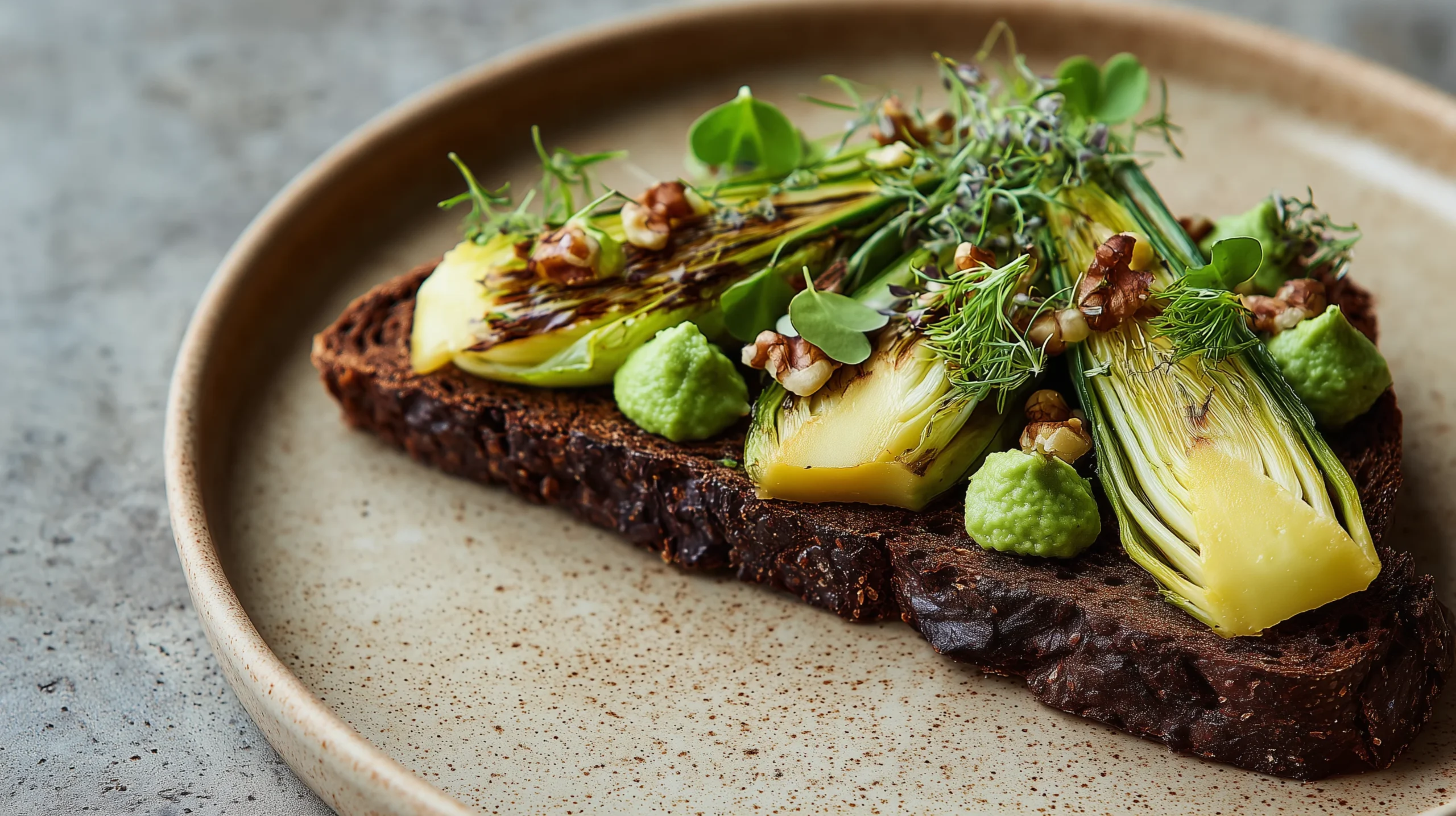 Das doppelte Fächer-Topping: Wir inszenieren zwei Gemüse-Stars auf dem Brot. Miso-glasierter Spitzkohl und aromatischer Lauch werden scharf angebraten und kunstvoll gefächert angerichtet – beide sind klar erkennbar und sorgen für ein tiefes Umami-Erlebnis.