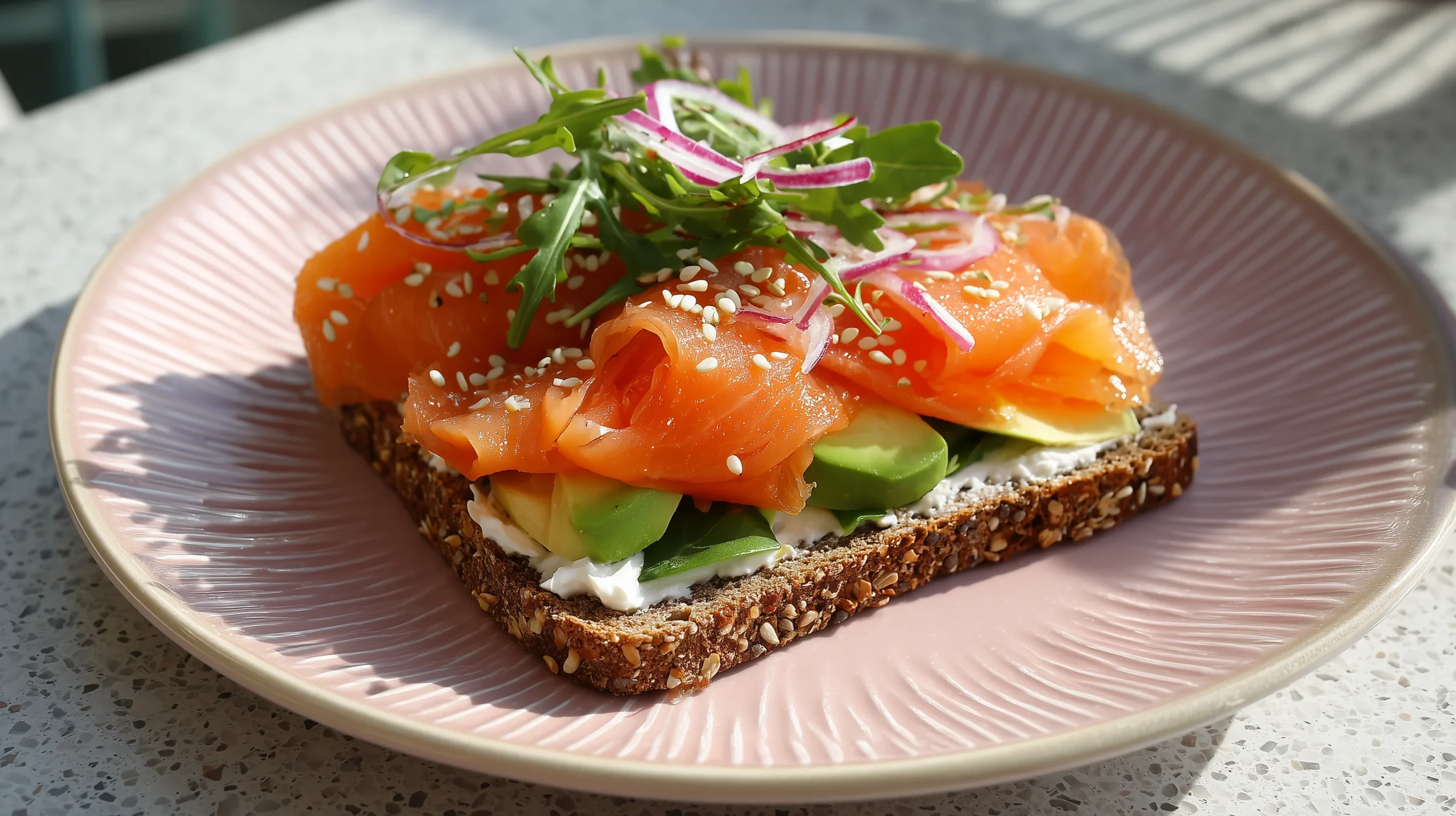Premium-Räucherlachs auf Roggenbrot mit cremiger Avocado und veganem Frischkäse. Der nordische Klassiker, leicht und modern interpretiert.